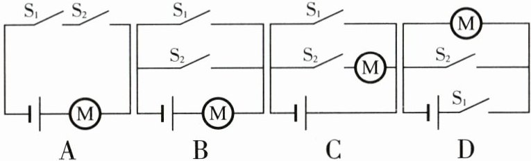 7. 小米同学家安装了密码门锁,能通过输入密码$(S_1)$或利用钥匙$(S_2)$单独驱动电动机工作而打开门锁。下列电路设计符合要求的是(
