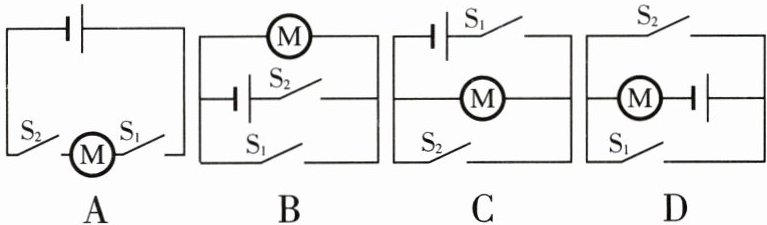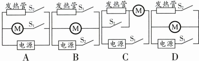 8. 某同学手中的实验器材有发热管、电动机、开关$S_1$和$S_2、$电源和导线若干,想设计一个电路来实现:同时闭合$S_1$和$S_2$产生热风;仅闭合$S_1$产生冷风;仅闭合$S_2$不发热也不吹风。下列电路图中符合要求的是 (