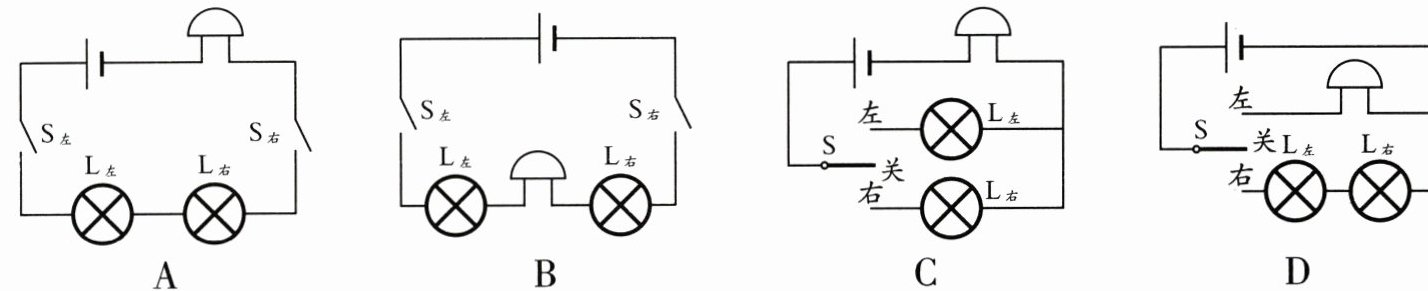 3. 新国标电动车上装有转向灯和蜂鸣器,开关拨至“左”,左转向灯亮、蜂鸣器响;开关拨至“右”,右转向灯亮、蜂鸣器响,左、右转向灯不能同时亮,下列电路图设计合理的是(