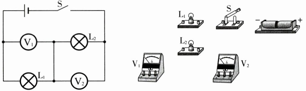 13. 根据左图所示电路图,用笔画线代替导线,将右图中的实物对应连接成完整电路。(已知电源由两节干电池串联组成)