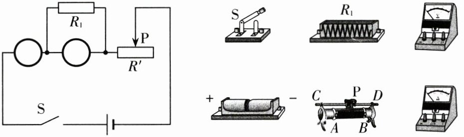 电路图中从左至右分别补充电流表、电压表。实物图如图所示
