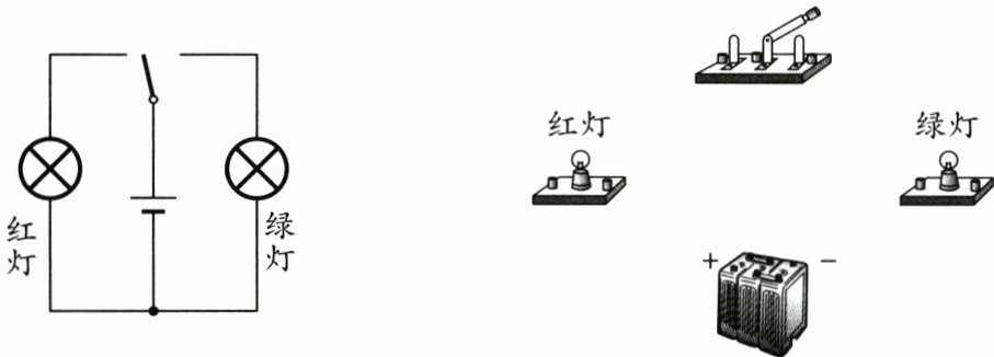 15. 左图所示的是用单刀双掷开关控制红灯、绿灯的电路图,请根据该电路图将右图中的元件连成电路。