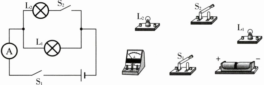 16. 根据下图所示的电路图,用笔画线代替导线,连接实物电路,使两个小灯泡中电流均不超过0.3 A。(要求:导线不能交叉)。