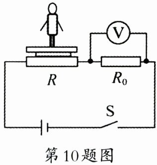 10. 科技创新小组设计了一台由电压表改装而成的简易体重计来动态监测学生的体重情况,其工作原理如图所示。电源电压保持不变, $ R_0 $ 为定值电阻,压敏电阻 $ R $ 的阻值随压力的增大而减小。闭合开关 $ S $,当有人测量体重时,下列说法正确的是(