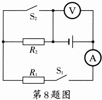 8. 如图所示的电路中, $ R_1 $ 和 $ R_2 $ 均为定值电阻,电源电压保持不变,闭合开关 $ S_1 $ 和 $ S_2 $,两电表均有示数。若只断开开关 $ S_2 $,则(