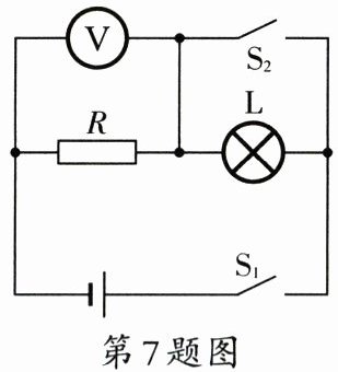 7. 如图所示,电源电压不变,开关 $ S_1 $ 闭合后,灯泡 $ L $ 发光,电压表有示数;再闭合开关 $ S_2 $ 后,出现的情况是(