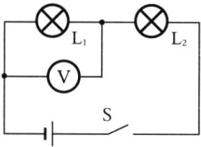 (4) 闭合开关后,小芳发现$L_1、$$L_2$均不发光,电压表有示数且大小接近3 V,则电路中出现的故障可能是$L_1$发生了_________(选填“短路”或“断路”)。