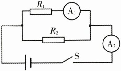 3. 如图所示,电路中电源电压保持不变,$R_{2}$的阻值为20Ω。闭合开关S,电流表$A_{1}$的示数为0.4A,电流表$A_{2}$的示数为0.3A。求:
