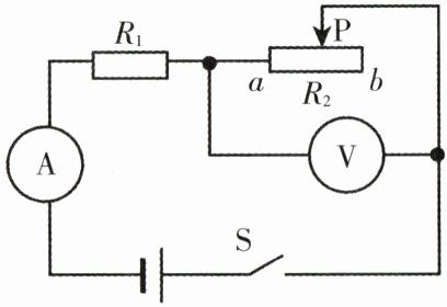 该电路为串联电路,$I_{1}$与$I_{2}$始终相等,当P在b端时,$\frac{8\ V}{R_{2}}=\frac{U-8\ V}{10\ \Omega}$,当P在中点时,$\frac{6\ V}{\frac{R_{2}}{2}}=\frac{U-6\ V}{10\ \Omega}$,可得$U=12\ V$,$R_{2}=20\ \Omega$。