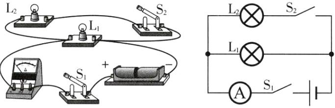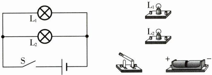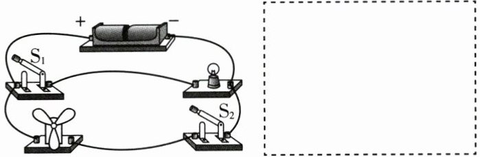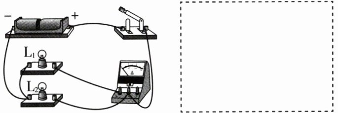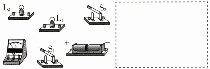6. 如图所示,用笔画线代替导线完成电路连接。要求:两灯并联,开关 $ S_1 $ 控制干路,开关 $ S_2 $ 控制灯泡 $ L_2 $,电流表测量干路中的电流。在其右侧的虚线框内画出对应的电路图。