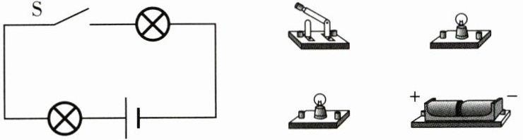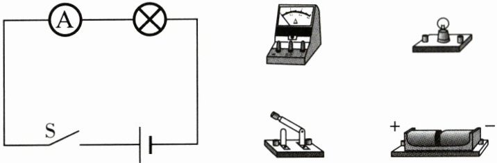 3. 用笔画线代替导线,根据电路图连接实物图,导线不能交叉(电路中的电流大约为 $ 0.4 \, A $)。