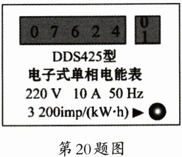 20. 如图所示是现在家庭常用的电子式电能表表盘,表盘上标有“$ 3200 \, imp/(kW \cdot h) $”,表示每消耗 $ 1 \, kW \cdot h $ 的电能,指示灯闪烁 $ 3200 $ 次。小明将某家用电器单独接在该电能表上正常工作 $ 6 \, min $,电能表指示灯闪烁了 $ 320 $ 次。该家用电器的额定功率是