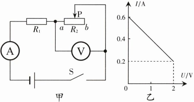 29. 如图甲所示的电路中$,R_1$为定值电阻$,R_2$为滑动变阻器,电源电压不变。闭合开关S后,滑动变阻器的滑片P从a端移动到b端,电流表示数I与电压表示数U的变化关系如图乙所示。求: