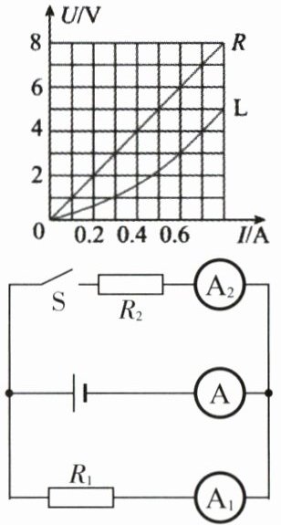 19. 有一定值电阻R与一小灯泡L,通过它们的电流I与它们两端的电压U的关系如图所示,现将R和L并联在电压为4V的电源两端,干路中的电流是