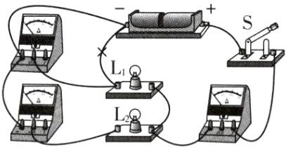 (2)小明用三只电流表和两个小灯泡做实验,连接的电路如图丙所示。其中有一根导线接错了,请在这根导线上打“$ × $”,表示这根导线不能这样连接,然后画出正确的连接位置。