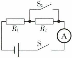 8. 如图所示,电源电压不变,当开关 $ S_1 $ 闭合、$ S_2 $ 断开时,电流表的示数为 $ 0.4\, A $; 当 $ S_1 $ 和 $ S_2 $ 都闭合时,电流表的示数为 $ 1.6\, A $, 则电阻 $ R_1 $ 与 $ R_2 $ 的比值为 (