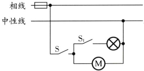 24. 如图,家庭电路中额定电压均为220V的电风扇M和电灯,只闭合开关S,风扇工作;只闭合开关$S_1,$灯泡和风扇都不工作;开关S、$S_1$都闭合,风扇和灯泡都工作。请用笔画线代替导线把电路连接完整。