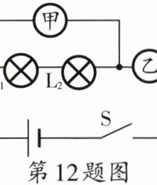 12. 如图所示电路中,在甲、乙两处接入电流表或电压表,闭合开关后,两灯均正常发光,甲应接