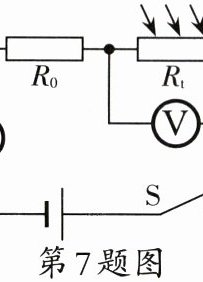 7. 如图所示电路中,$R_{0}$是定值电阻,$R_{t}$是阻值随光照强度增大而减小的光敏电阻。闭合开关S,逐渐增大光敏电阻的光照强度,关于两个电表示数的说法中,正确的是(