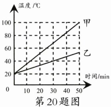 20. 用两个相同的电热器分别给质量和初温都相同的水、煤油两种液体同时加热,两种液体的温度随时间变化的图像如图所示。根据图像可判断______(选填“甲”或“乙”)液体是水。水结冰后它的比热容将______(选填“变大”“变小”或“不变”)。