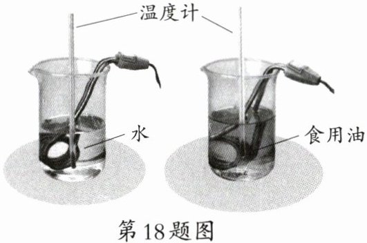 18. 如图所示是“比较水和食用油的吸热能力”的实验装置,图中相同的烧杯所装的水和食用油的体积______(选填“相同”或“不同”),在电加热过程中,电能转化为______。