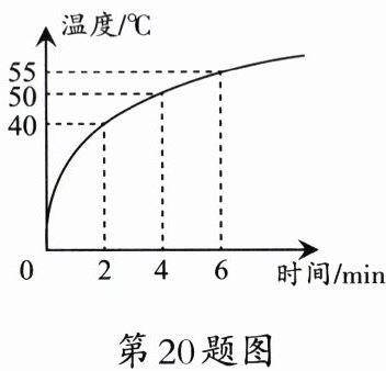 20. 某物理兴趣小组的同学用煤炉给 $ 10 $ kg 的水加热,同时绘制了如图所示的加热过程中水温随时间变化的图像,若在 $ 6 $ min 内完全燃烧了 $ 0.2 $ kg 的煤,煤的热值为 $ 3×10^{7} $ J/kg。煤完全燃烧产生的热量为
