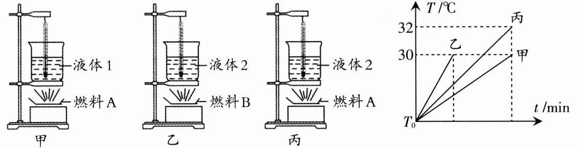 21. 如图所示,为比较 1、2 两种液体的比热容及 A、B 两种燃料的热值,甲、乙、丙三图中的装置相同,燃料的质量均为 $ 10 $ g,烧杯内的液体初温相同, $ T_{0} = 22 $℃,三组实验均至燃料燃尽时的液体温度变化如图所示。
