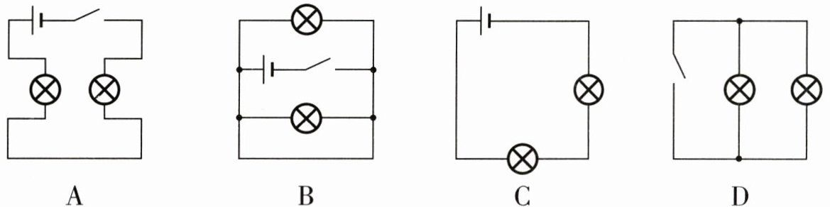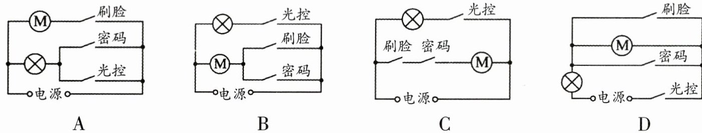 10. 小明同学设计了“楼道门禁”模型。光线较暗时,光控开关闭合提供照明;刷脸或输入密码时,开关闭合,门锁打开。下列电路设计符合要求的是 (