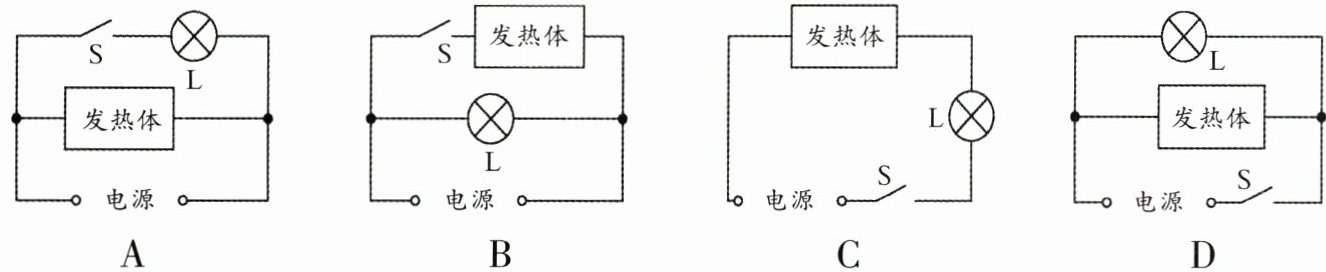 8. 电热蚊香器是一种常用的除蚊工具。当蚊香器接上电源,需要闭合开关 S,才能使指示灯 L 发光,发热体工作。现由于某种原因指示灯断路不亮,但发热体依然能正常工作。则下列电路连接方式符合要求的是 (