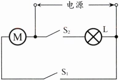 20. 盛夏,郑能同学要把矿泉水放在冰箱冷藏室中冷藏,激发了他对冰箱的研究兴趣。打开冰箱冷藏室的门,里面的灯就亮了,此时制冷压缩机的电动机并没有工作,那么压缩机的电动机靠什么来控制呢? 他查了资料,知道是靠温控开关控制的,于是他画出了电冰箱的部分电路,如图所示。图中 L 是电冰箱内的照明灯,M 是压缩机用的电动机。开关$ S_1、$$S_2 $都闭合时,L 与 M 的连接方式是