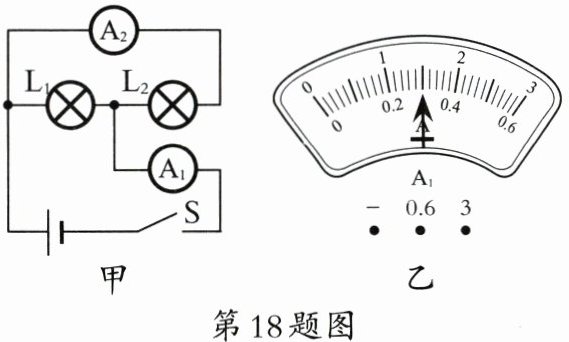 18. 如图甲所示的电路图中,闭合开关 S,两灯泡均发光,且两个完全相同的电流表指针偏转均如图乙所示,则通过$ L_1 $的电流为