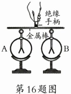 16. 如图所示,取两个相同的不带电的验电器 A 和 B。用丝绸摩擦过的玻璃棒去接触验电器 B 的金属球后,验电器 B 带