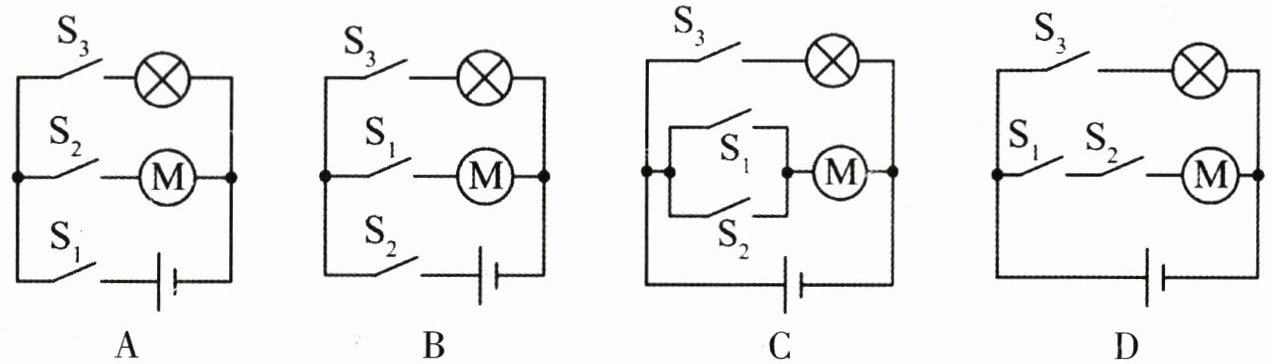 9. 某自动售货机,它可通过手机扫码(闭合$S_1)$或投币(闭合$S_2),$启动电动机完成自动售货;在光线较暗时,光控开关$S_3$自动闭合,接通灯泡照明。符合上述情况的电路设计是下图中的(