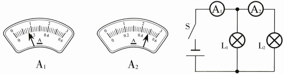 27. 当电路中的开关 $ S $ 闭合时,两只电流表 $ A _ { 1 } $、$ A _ { 2 } $ 的示数分别如图所示。求: