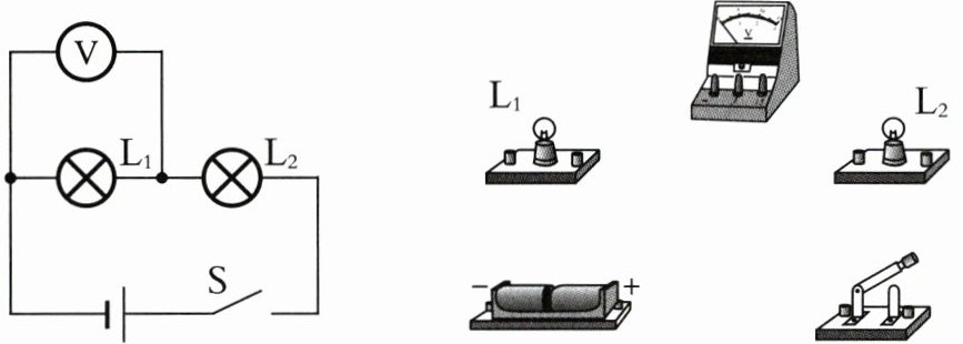 17. 如图所示的电路中, 当 S 和 $ S_1 $ 闭合、$ S_2 $ 断开时, 电压表示数为 3.8 V。当 S 和 $ S_2 $ 闭合、$ S_1 $ 断开时, 电压表示数为 6 V, 则此时灯泡 $ L_1 $ 两端电压为