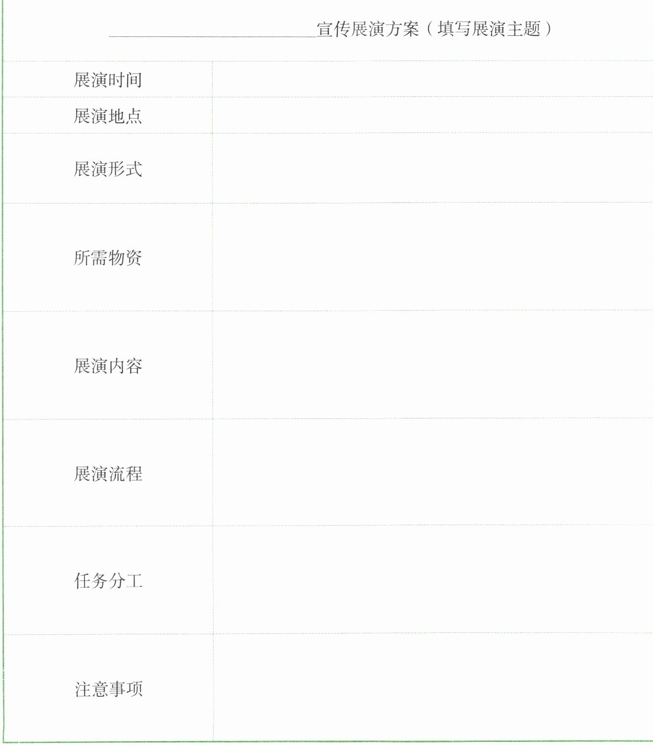 小组讨论,拟订展演方案,明确展演的时间、地点、形式、所需物资、内容、流程等,你可以填写下表。如果有费用支出,还需要做好预算。