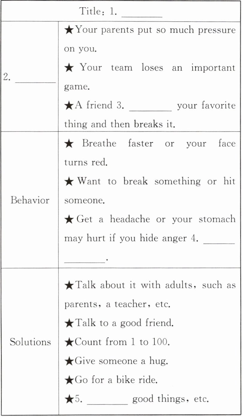 | ★Breathe faster or your face turns red. ★Want to break something or hit someone. ★Get a headache or your stomach may hurt if you hide anger 4.