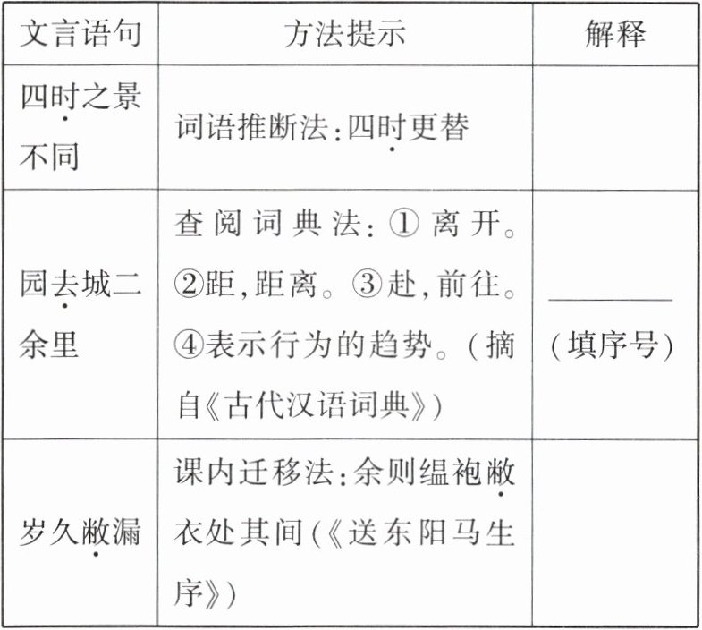 |园去城二余里|查阅词典法:①离开。②距,距离。③赴,前往。④表示行为的趋势。(摘自《古代汉语词典》)|____(填序号)|