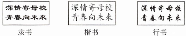 1.【示例】选楷书。端正的楷书,更能体现对母校的深厚感情。(选其他字体,有合适理由即可) 2.【示例】校园撷景。 走进校园,处处都是文雅的、诗意的、美丽的。随意采撷一处风景,便又是难忘的一隅。 3.【示例】朗读情感:朗读时,感情要饱满投入,富有激情,尤其两分句的后半句,语调要高扬,表示自己坚定的决心。