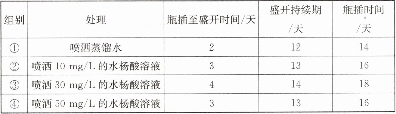 下表为喷洒不同浓度的水杨酸对瓶插的月季切花寿命及品质的影响。