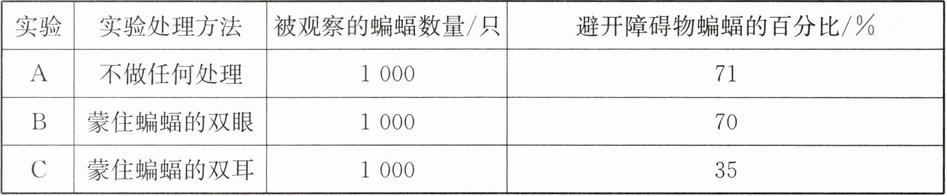 (3)蝙蝠是通过双耳来“发现"障碍物的,蝙蝠撞击或避开障碍物的行为与眼睛无关。