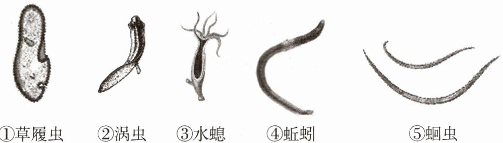 15. 下图为生活在水中或潮湿环境中的五种无脊椎动物,请据图回答下列问题。