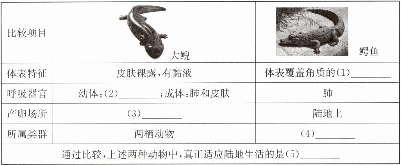 9. 大鲵和鳄鱼都既可以在水中生活,也能在陆地上活动,它们外形相似,但却属于不同的类群。请根据所学知识补全下表。