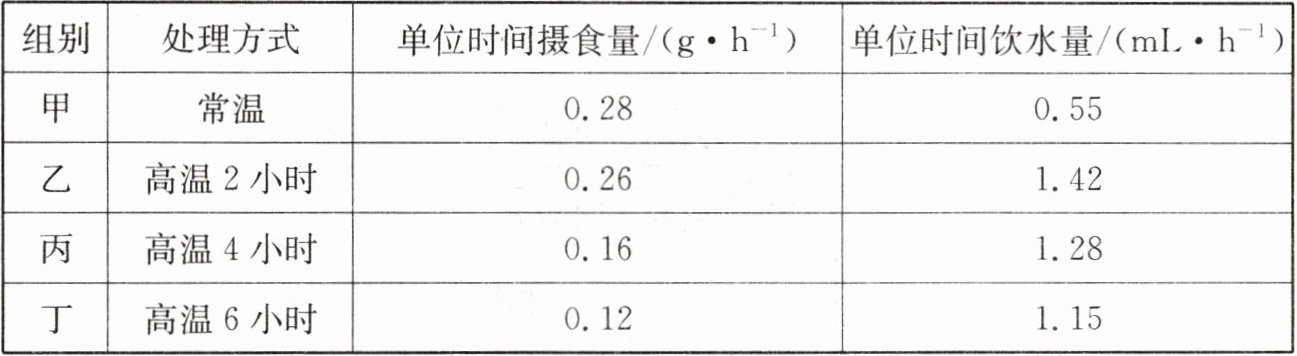 ②将预处理过的树麻雀随机分为 4 组并转移至相应的培养箱中,处理相应的时间后,统计各组中树麻雀的单位时间摄食量和饮水量,结果记录如下表。