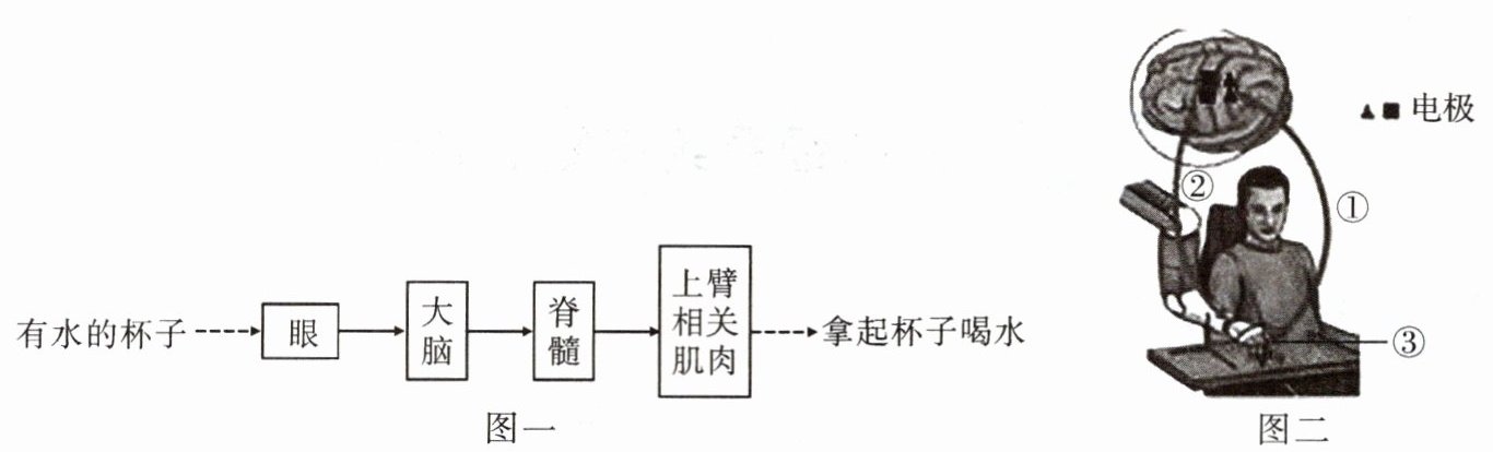 14. 脑机接口是在脑与外部电子设备间建立的全新通讯和控制技术。智能仿生手是依拖于脑机接口技术的残障人士的辅助工具,它可以识别佩戴者脑部发出的神经信号,让上臂截肢患者像控制自己原本的手一样对其进行控制。图一是某人喝水的反射活动图解,请你结合所学知识回答问题。