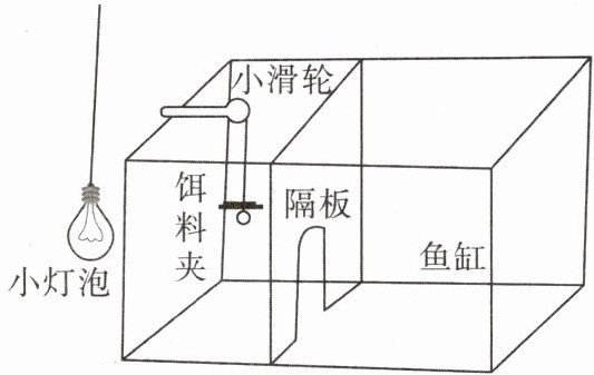 ①在鱼缸的三分之一处加一块隔板,在隔板下方开一个洞,左边投饵室的小滑轮上悬吊一个饵料夹,鱼缸左侧再悬挂一个小灯泡,如图所示。