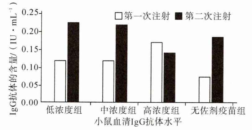 。(3)分析图中的数据,第二次免疫注射后,高浓度组 IgG 抗体含量________(填“高于”或“低于”)无佐剂疫苗组,低浓度组和中浓度组的 IgG 抗体含量显著________(填“高于”或“低于”)无佐剂疫苗组。