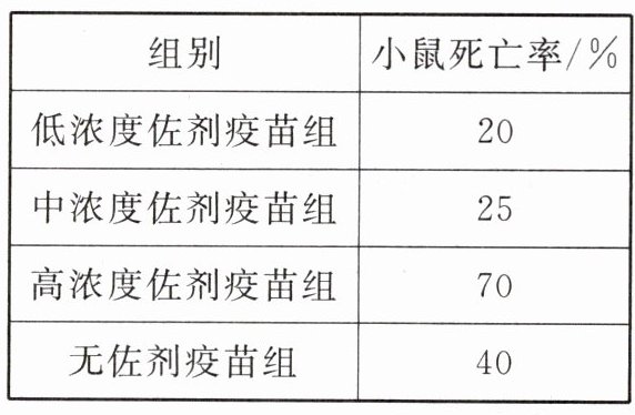 ③在第二次免疫注射 21 天后,给所有小鼠腹腔注射副猪嗜血杆菌毒株,记录小鼠临床表现,并统计小鼠死亡率,结果如下表所示。