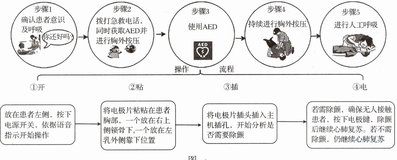 11. 心脏骤停威胁人的生命,室颤是其中的一个诱因。及时除颤对挽救生命极其重要,除颤越早,患者的救助成功率越高,所以急救的“黄金四分钟”显得非常重要。一些城市的地铁站、大型商场等人员密集场所均设有自动体外除颤仪(AED)。急救操作和使用AED的流程如图所示: