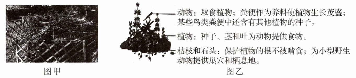 10. 如图所示,在许多公园里能够看到由石块、枯枝落叶、含有土壤的种子堆积在一起构成的本杰士堆(指人造灌木丛)。以下关于本杰士堆的说法错误的是(